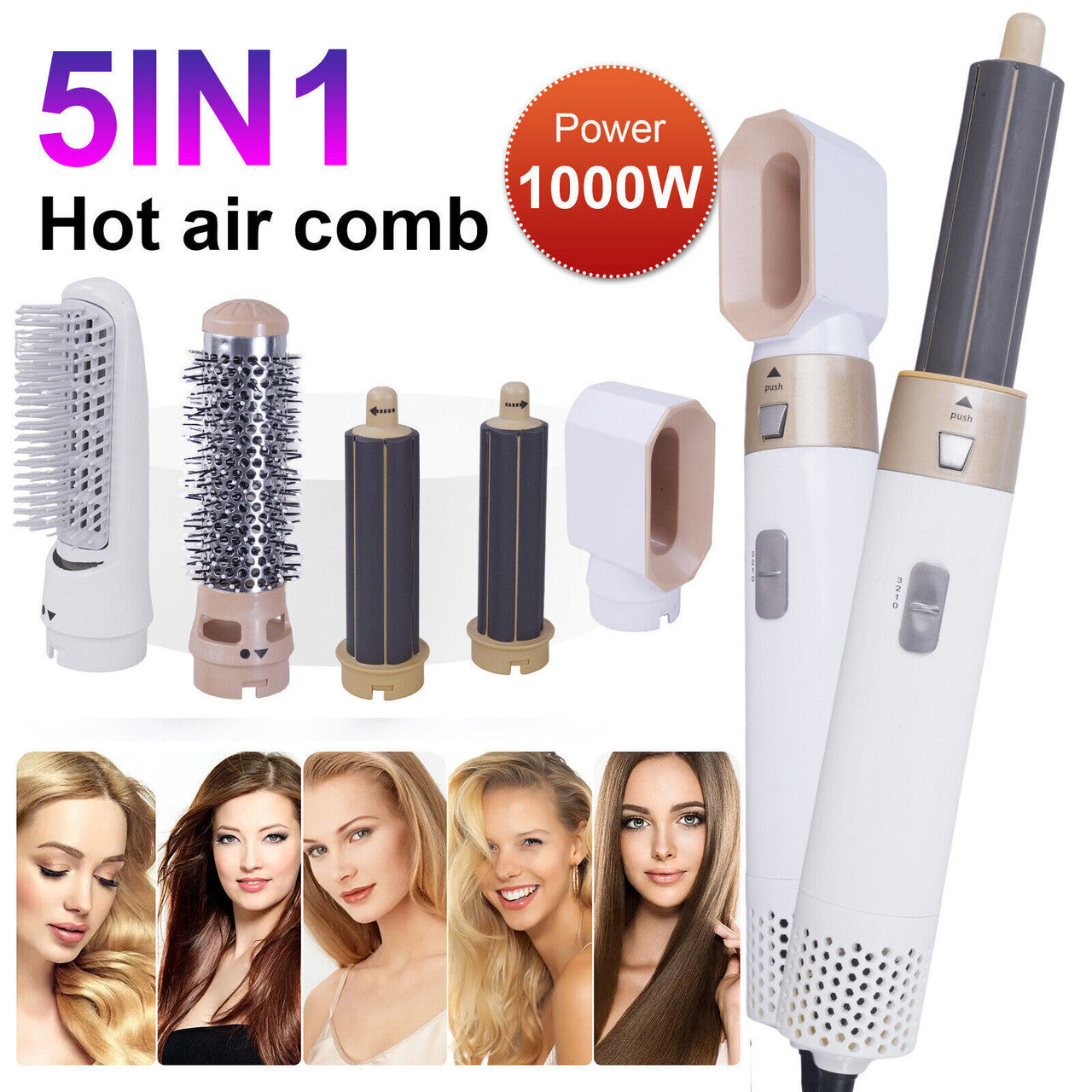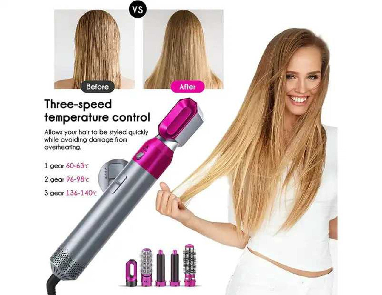 This hair dryer brush, with 5 brushes attached, is a combination of multiple hairdressing instruments. It can act as a hairdryer, a hair straightener, a hair curler, and a hair volumizer. Like a hairdryer, it can quickly dry your hair with strong wind; as a hair straightener, it can straighten your hair with less frizz; as a hair curler, it can be used to curl your hair and add its volume; as a hair volumizer, it can volumize your hair from its end.